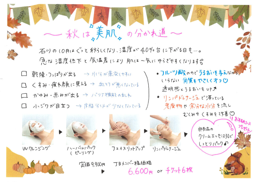 ~夏肌をリセット!秋はしっとりつや肌に~ 所要時間 約70分 新規&ビジター様価格 ¥9,900(税込) JBメンバー様価格 ¥6,600(税込) 1Wクレンジング 2.ハーバルパック(ピーリング) 3.フェイスリフトアップ 4,リンパドレナージュ
