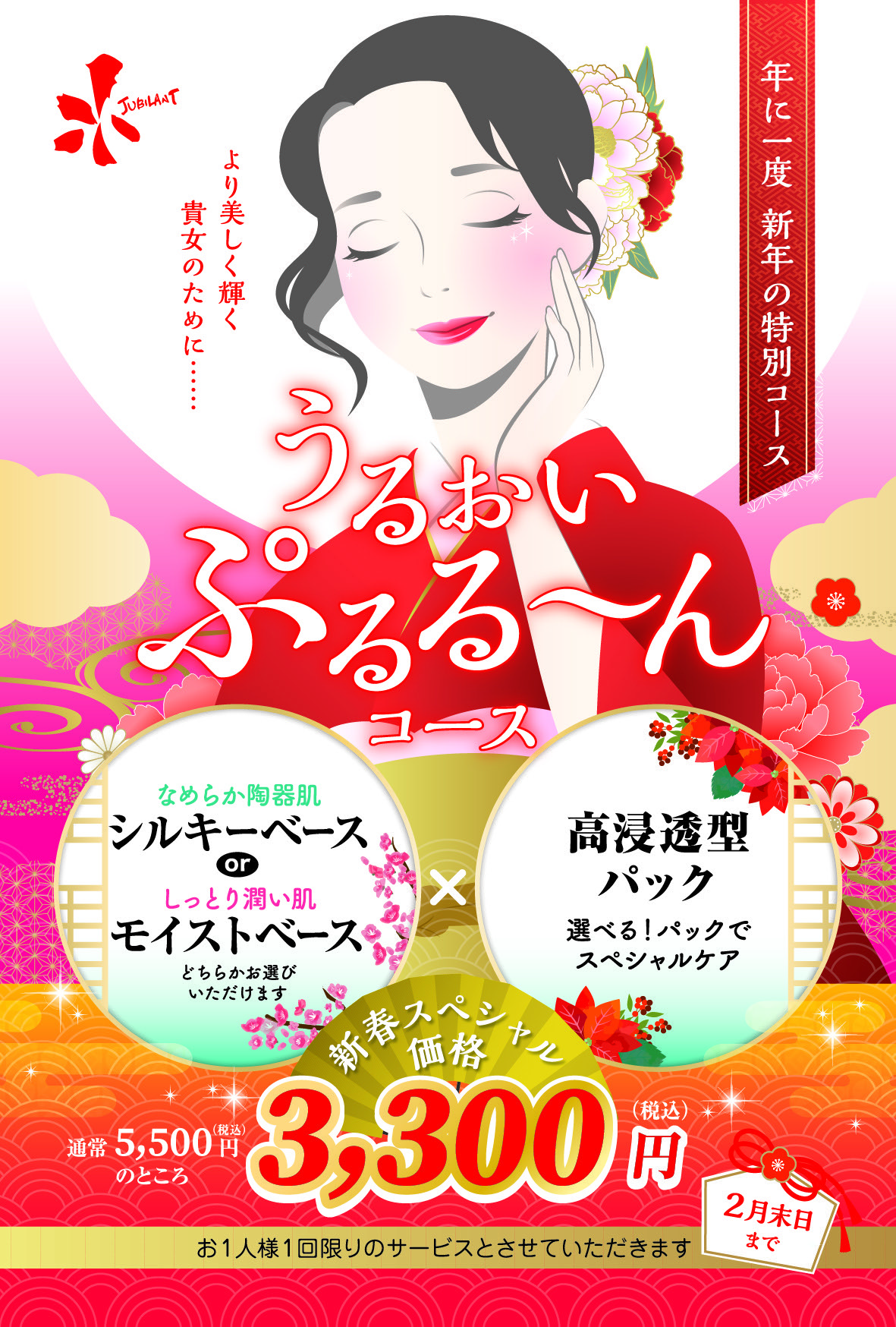 ~年に一度 新年の特別コース~ 所要時間 約70分 新規&ビジター様価格 ¥3300(税込) JBメンバー様価格 ¥3300(税込) 1Wクレンジング 2.酵素パック(ピーリング)又はニュートリーム(栄養補給) 3.フェイスリフトアップ 4,肌別パック